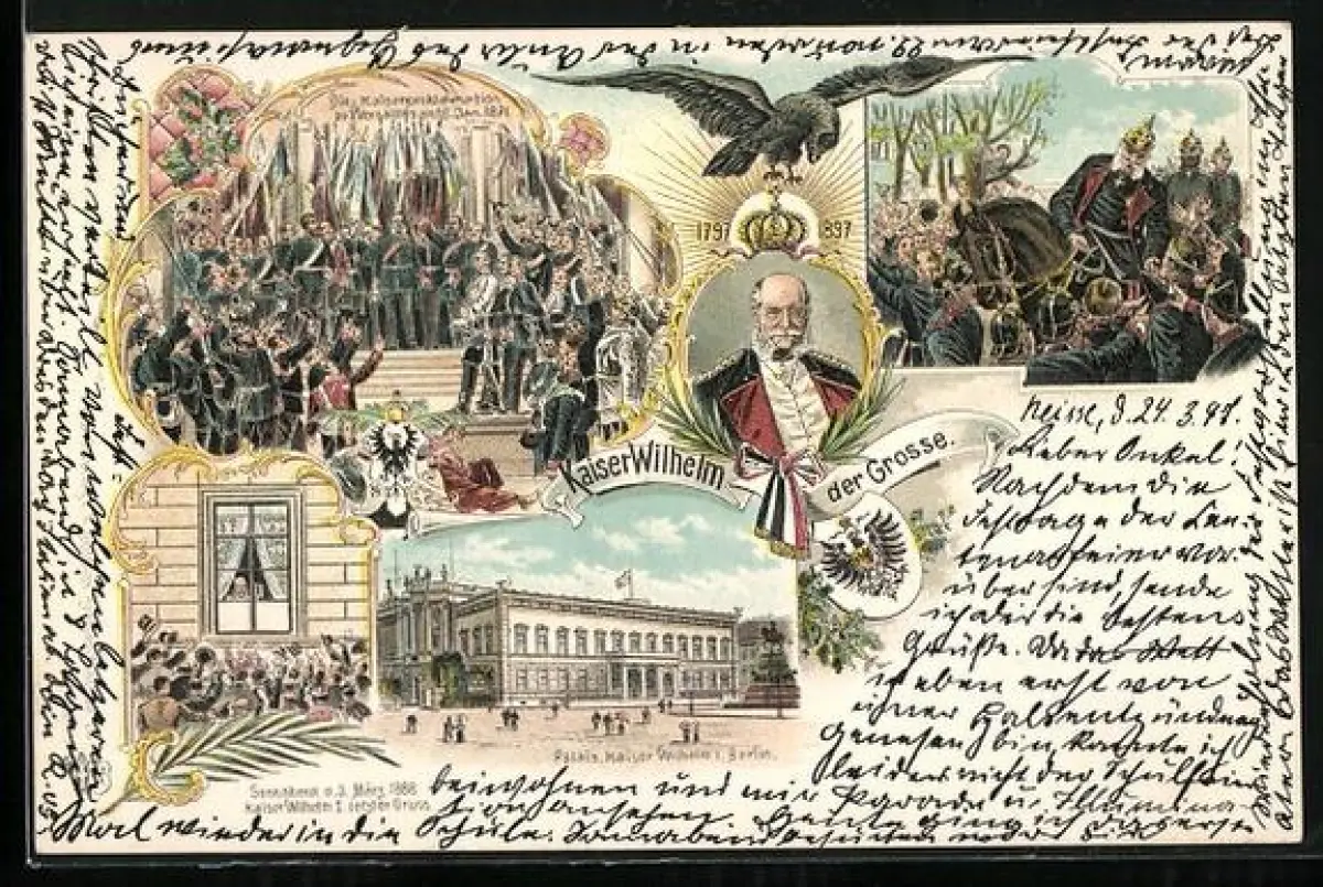 Lithographie Porträt von Kaiser Wilhelm I., Kaiserproklamation