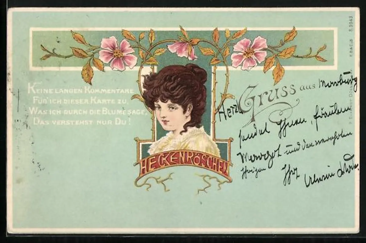 Lithographie Portrait eines hübschen Fräulein mit Heckenröschen im Jugendstil