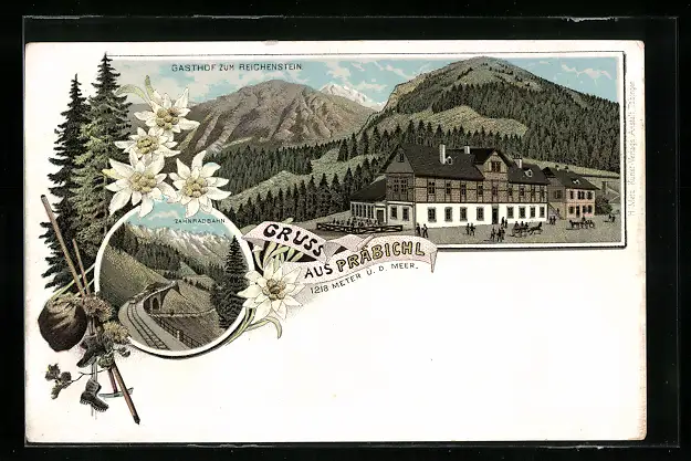 Lithographie Präbichl, Gasthof zum Reichenstein, Zahnradbahn, Edelweiss
