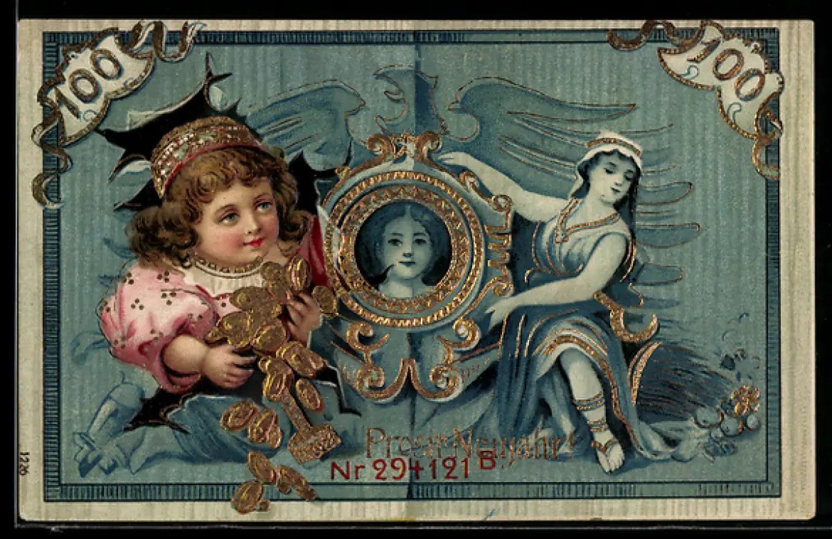Lithographie Prosit Neujahr, Kind platzt durch Banknote