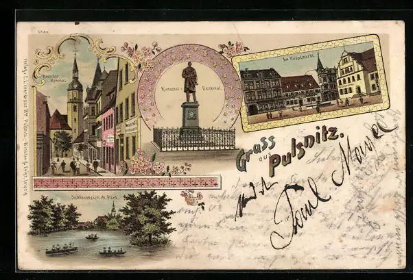 Lithographie Pulsnitz, Rietschel-Denkmal, Kirche, Hauptmarkt, Schlossteich
