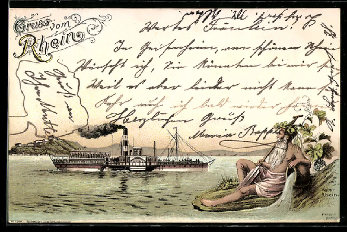 Lithographie Raddampfer Mainz in Fahrt auf dem Rhein, Vater Rhein am Ufer