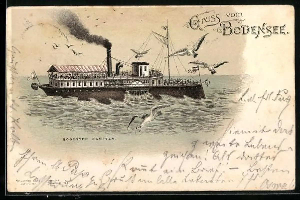 Lithographie Raddampfer in Fahrt auf dem Bodensee, Möwen