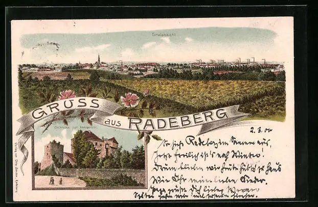 Lithographie Radeberg, Schloss, Amtsgericht, Totalansicht