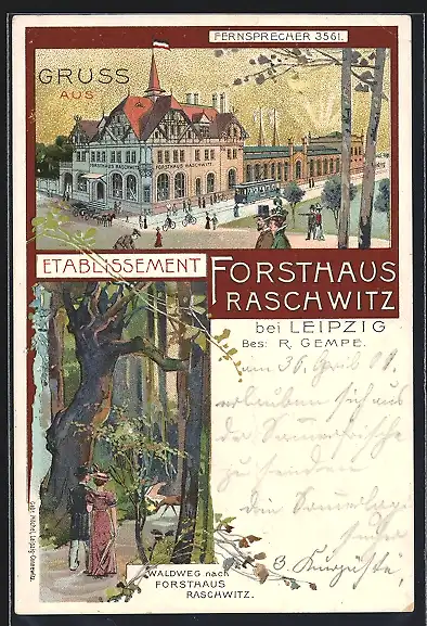Lithographie Raschwitz b. Leipzig, Gasthaus Forsthaus v. R. Gempe