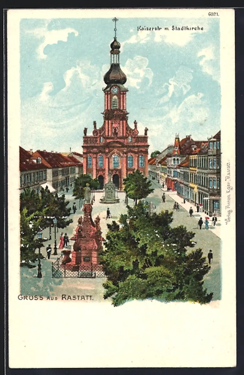 Lithographie Rastatt, Kaiserstrasse mit Stadtkirche und Denkmal