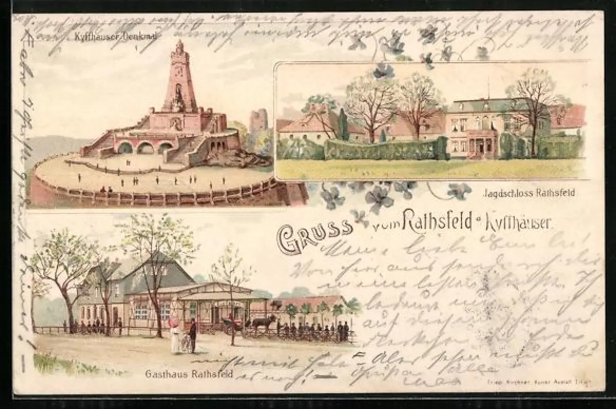 Lithographie Rathsfeld a. Kyffhäuser, Gasthaus Rathsfeld, Jagdschloss Rathsfeld, Kyffhäuser Denkmal