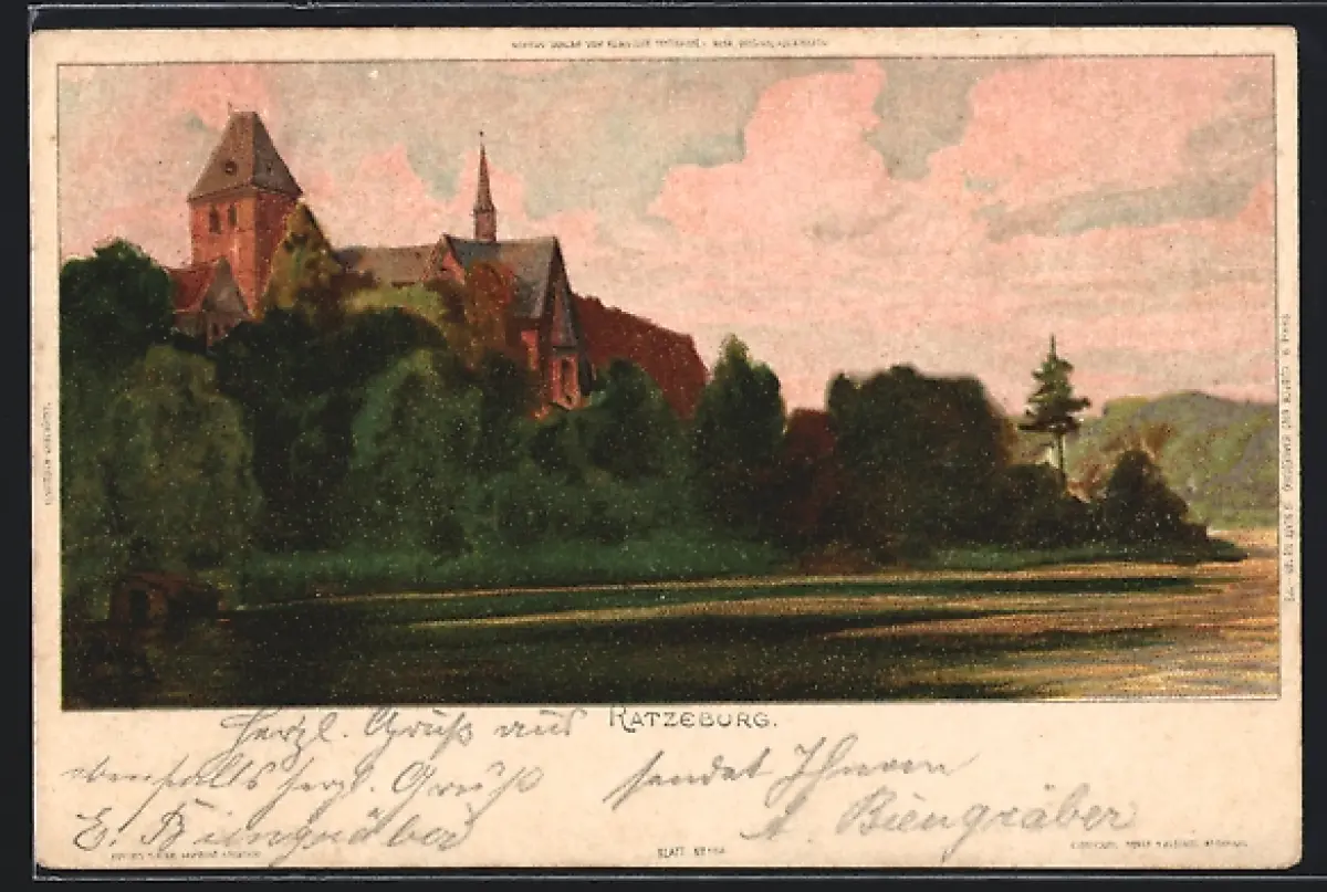 Lithographie Ratzeburg, Ortsansicht vom Wasser aus