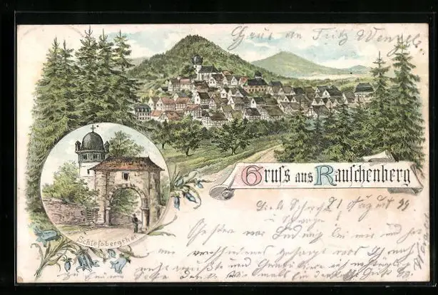 Lithographie Rauschenberg, Ortsansicht, Schlossbergthor