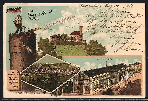 Lithographie Ravensburg, Veitsburg, Neue Concert-Halle, Ortspanorama
