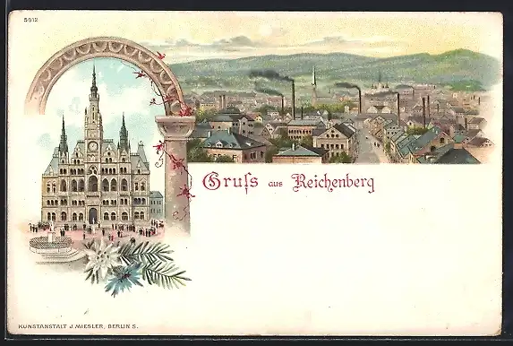 Lithographie Reichenberg / Liberec, Rathaus, Ortspanorama
