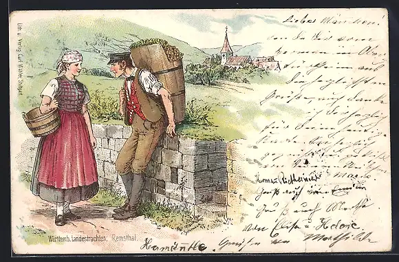 Lithographie Remsthal, Paar in Württemberg. Landestracht bei der Weinlese