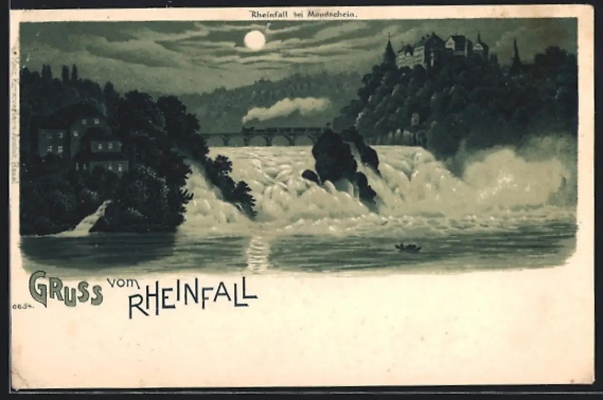 Lithographie Rheinfall, Ortsansicht vom Wasser aus, mit Bahnviadukt