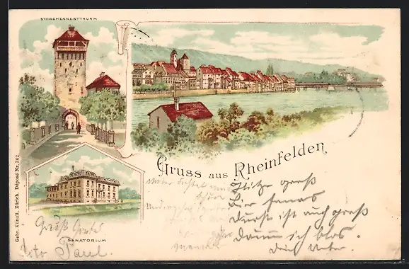 Lithographie Rheinfelden, Storchennestturm, Sanatorium, Totalansicht