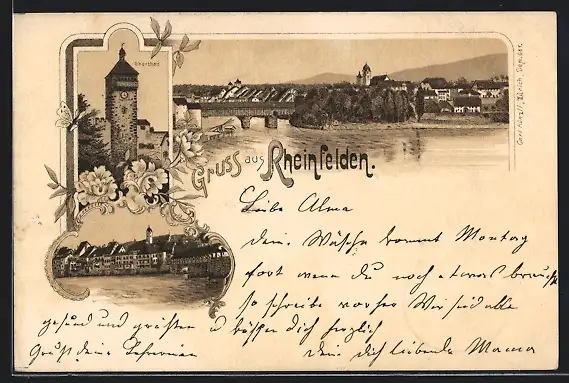 Lithographie Rheinfelden, Teilansicht mit Kirche, Obertor, Uferpartie