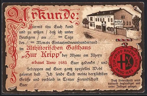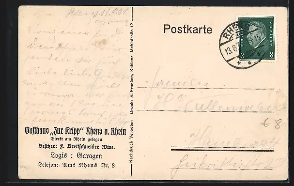 Lithographie Rhens a. Rhein, Gasthaus Zur Kripp, Trinkergrusskarte