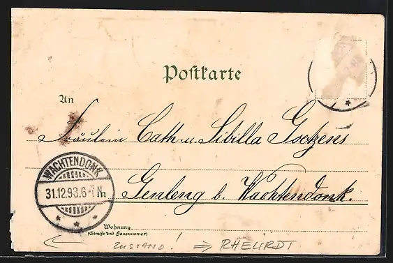 gelaufen 1898, Briefmarke entfernt, rückseitig Oberflächenschaden, Ecken bestoßen, Eckschaden re. unten, rechte Kante beschnitten