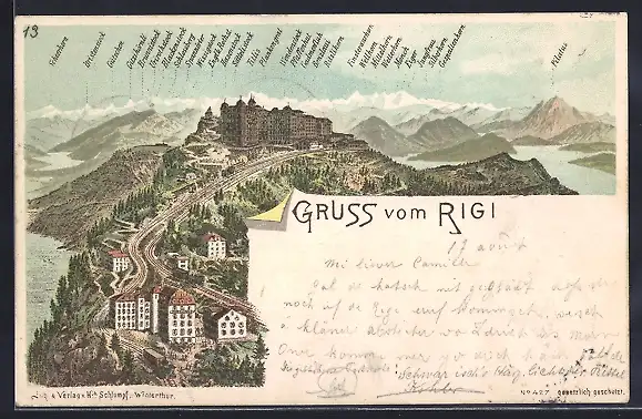 Lithographie Rigi, Blick auf den Ort mit Bergbahn, Gebirgspanorama
