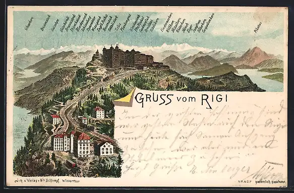 Lithographie Rigi, Hotels auf dem Rigi, Bergbahn, Alpenpanorama