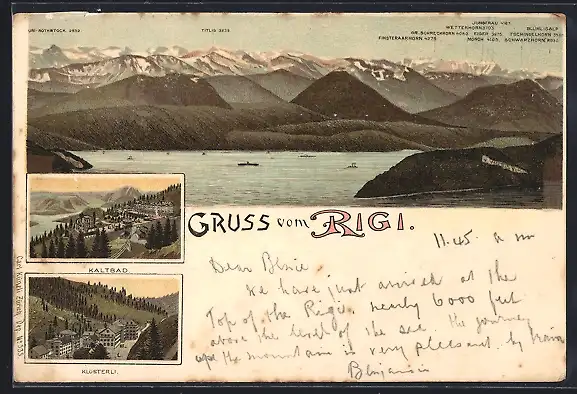 Lithographie Rigi-Kaltbad, Seeblick mit Bergpanorama