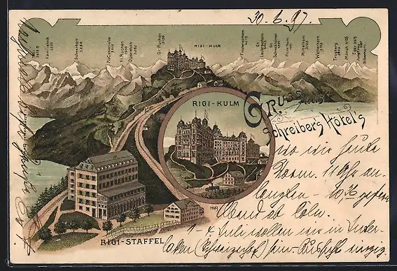 Lithographie Rigi-Kulm, Schreibers Hotel und Alpenpanorama
