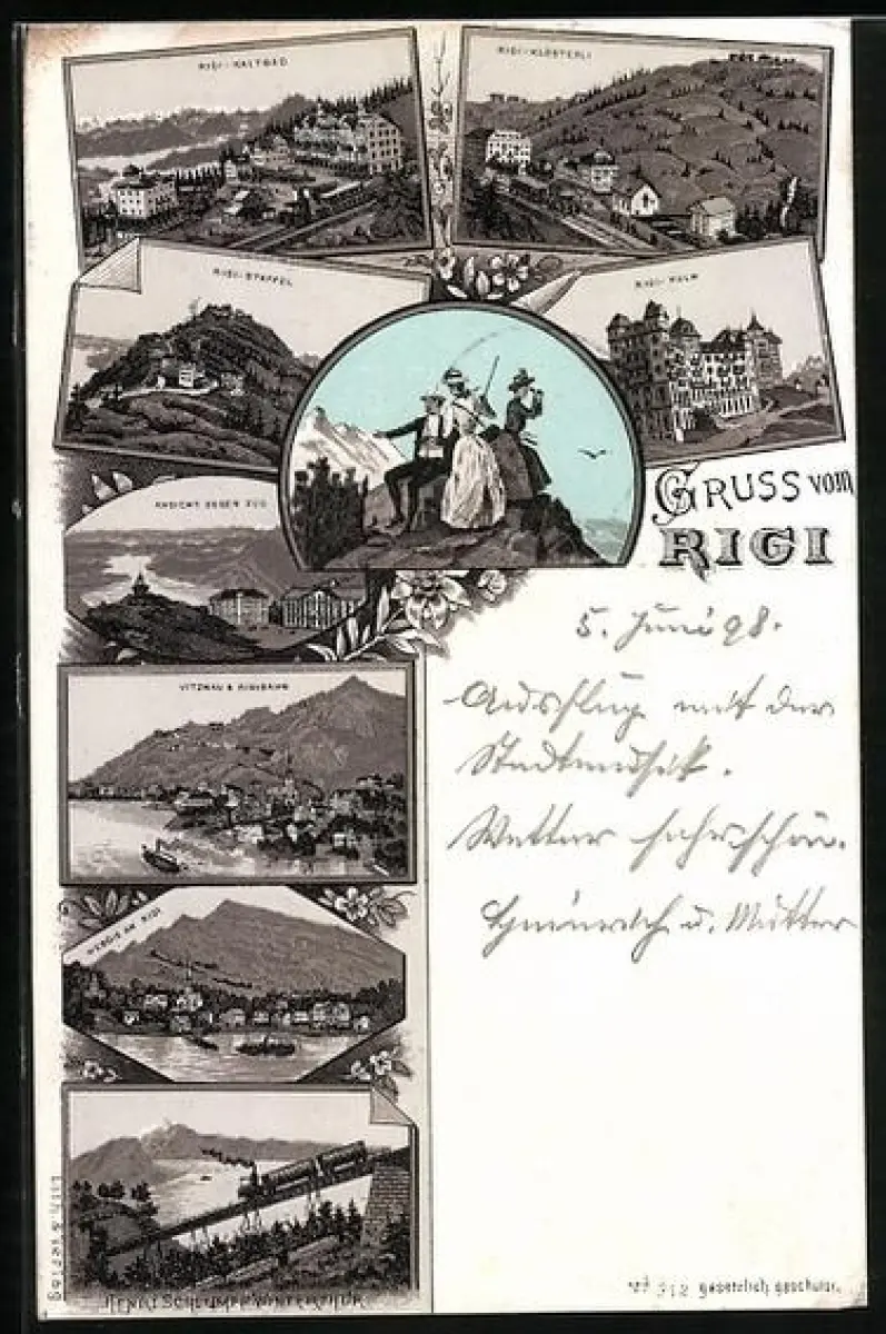 Lithographie Rigi, Rigi-Kaltbad, Rigi-Klösterli, Rigi-Staffel, Rigi-Kulm, Ansicht gegen Zug, Weggis am Rigi