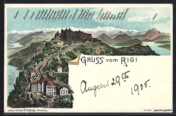 Lithographie Rigi, an der Rigibahn hinauf zur Kulm