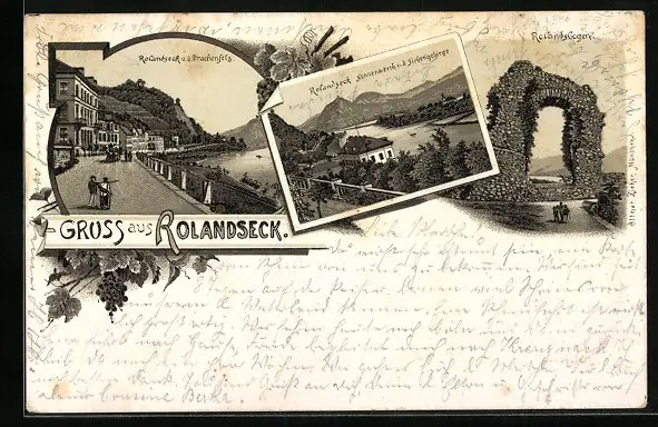 Lithographie Rolandseck, Rolandsbogen, Drachenfels, Nonnenwerth und Siebengebirge