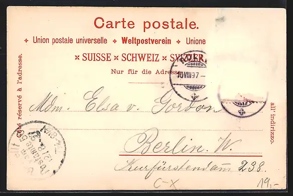 gelaufen 1897, Briefmarke entfernt, rückseitig Oberflächenschaden, Bugspur li. oben, guter Zustand