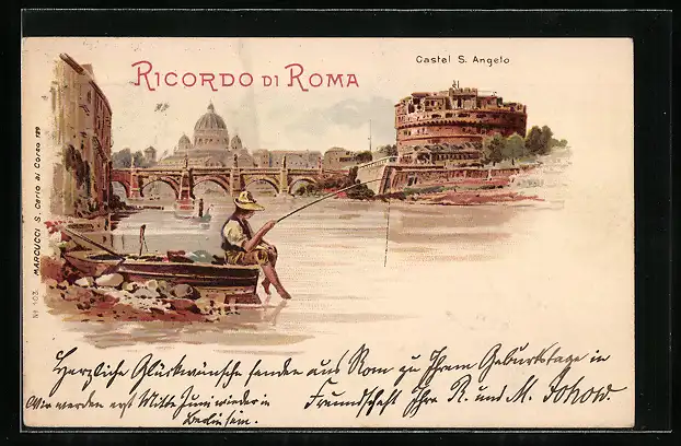 Lithographie Rom, Partie mit Angler am Castel S. Angelo