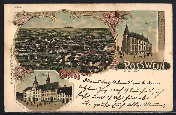 Lithographie Rosswein, Post, Rathaus, Ortsansicht