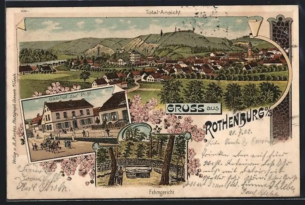 Lithographie Rothenburg a. S., Gasthof zur Post, Fehmgericht, Totalansicht des Ortes