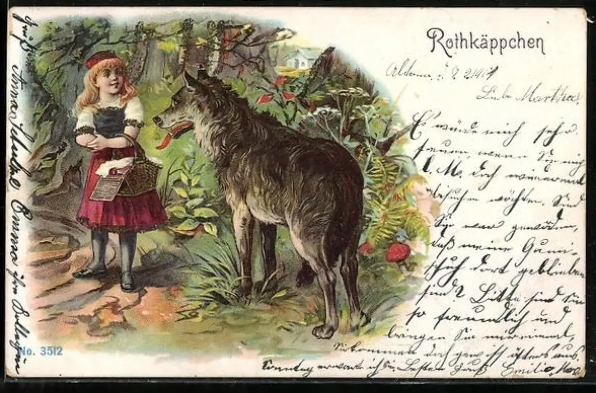 Lithographie Rotkäppchen trifft mit Korb auf den Wolf