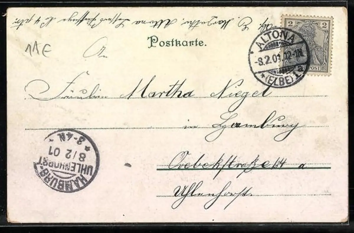 Personenbezogene Daten auf der Rückseite der Karte wurden durch blauen Textmarker unkenntlich gemacht. Die blauen Stellen sind auf die Vorderseite durchgeweicht und wirken sich negativ auf das Postkartenfoto aus