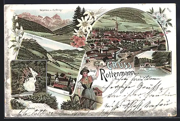 Lithographie Rottenmann, Badeanstalt, Wasserfall, Klamm, Schloss Strechau