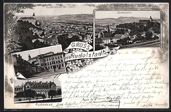 Lithographie Rudolstadt, Ortsansicht vom Hain, Markt, Rudolsbad
