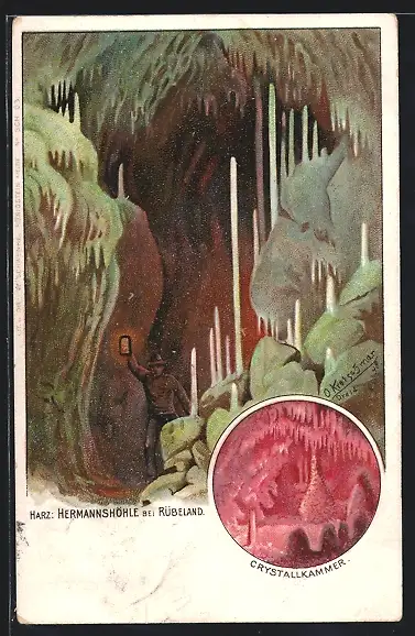 Lithographie Rübeland /Harz, Hermannshöhle u. Mann mit Laterne, Crystallkammer