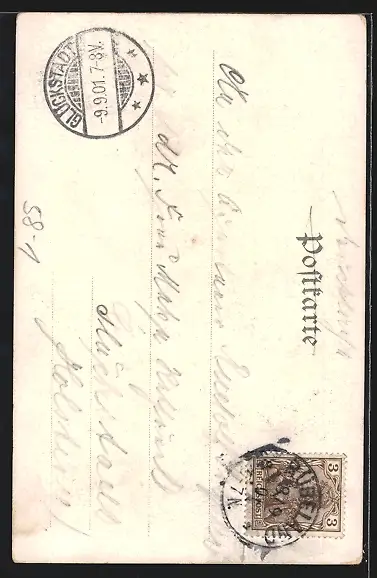 Personenbezogene Daten auf der Rückseite der Karte wurden durch blauen Textmarker unkenntlich gemacht. Die blauen Stellen sind auf die Vorderseite durchgeweicht und wirken sich negativ auf das Postkartenfoto aus