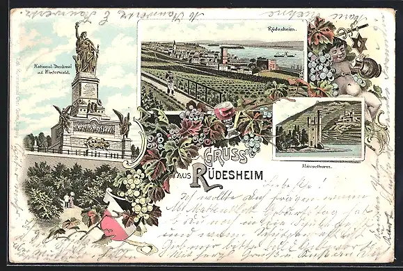 Lithographie Rüdesheim / Rhein, National-Denkmal auf dem Niederwald, Ortsansicht, Mäusethurm