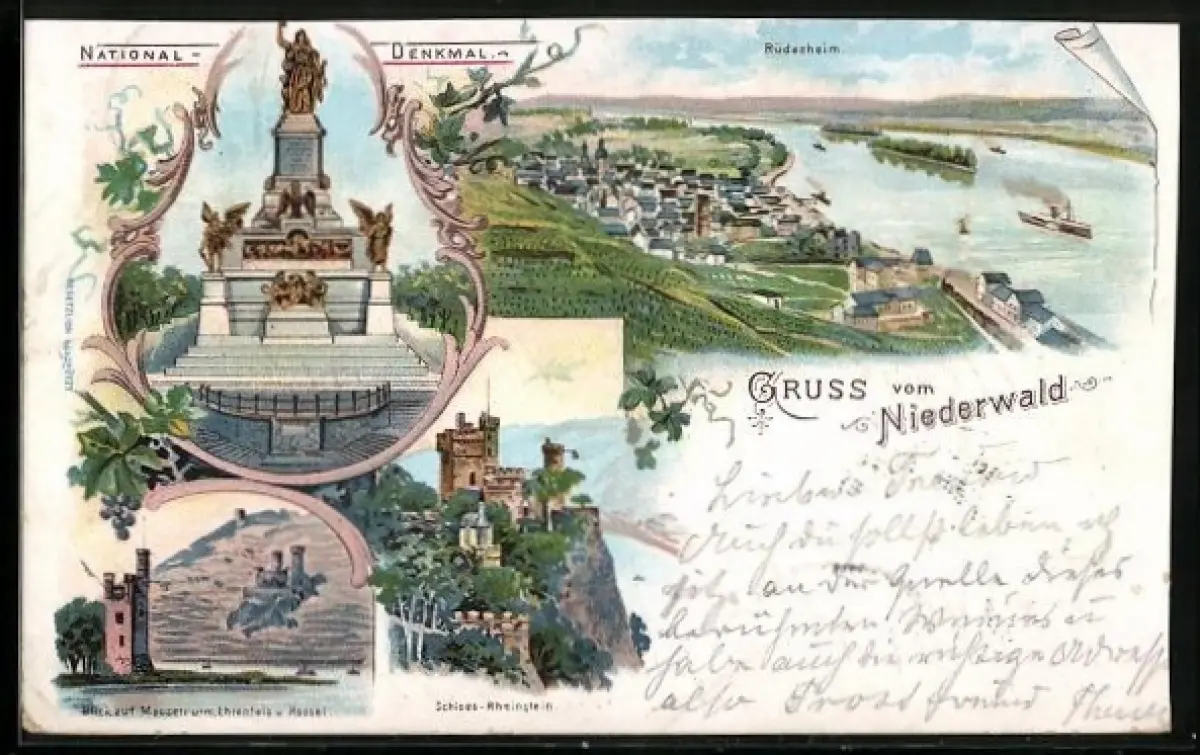 Lithographie Rüdesheim am Rhein, National-Denkmal, Blick auf Mäusethurm, Ehrenfels u. Rossel, Schloss-Rheinstein