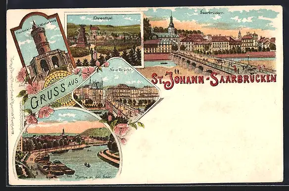 Lithographie Saarbrücken-St. Johann, Partie an der Saar, Neue Brücke, Denkmal a. d. Winterberg