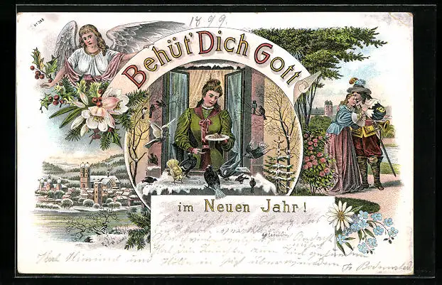 Lithographie Säckingen, Trompeter von Säckingen mit Geliebter, Ortsansicht, Engel, Neujahrsgruss, Behüt Dich Gott!