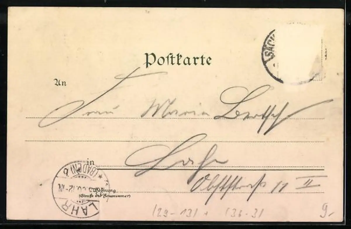 Personenbezogene Daten auf der Rückseite der Karte wurden durch blauen Textmarker unkenntlich gemacht. Die blauen Stellen sind auf die Vorderseite durchgeweicht und wirken sich negativ auf das Postkartenfoto aus