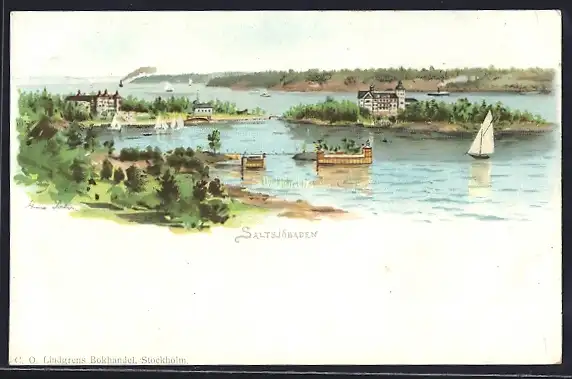 Lithographie Saltsjöbaden, Inselpanorama mit Booten