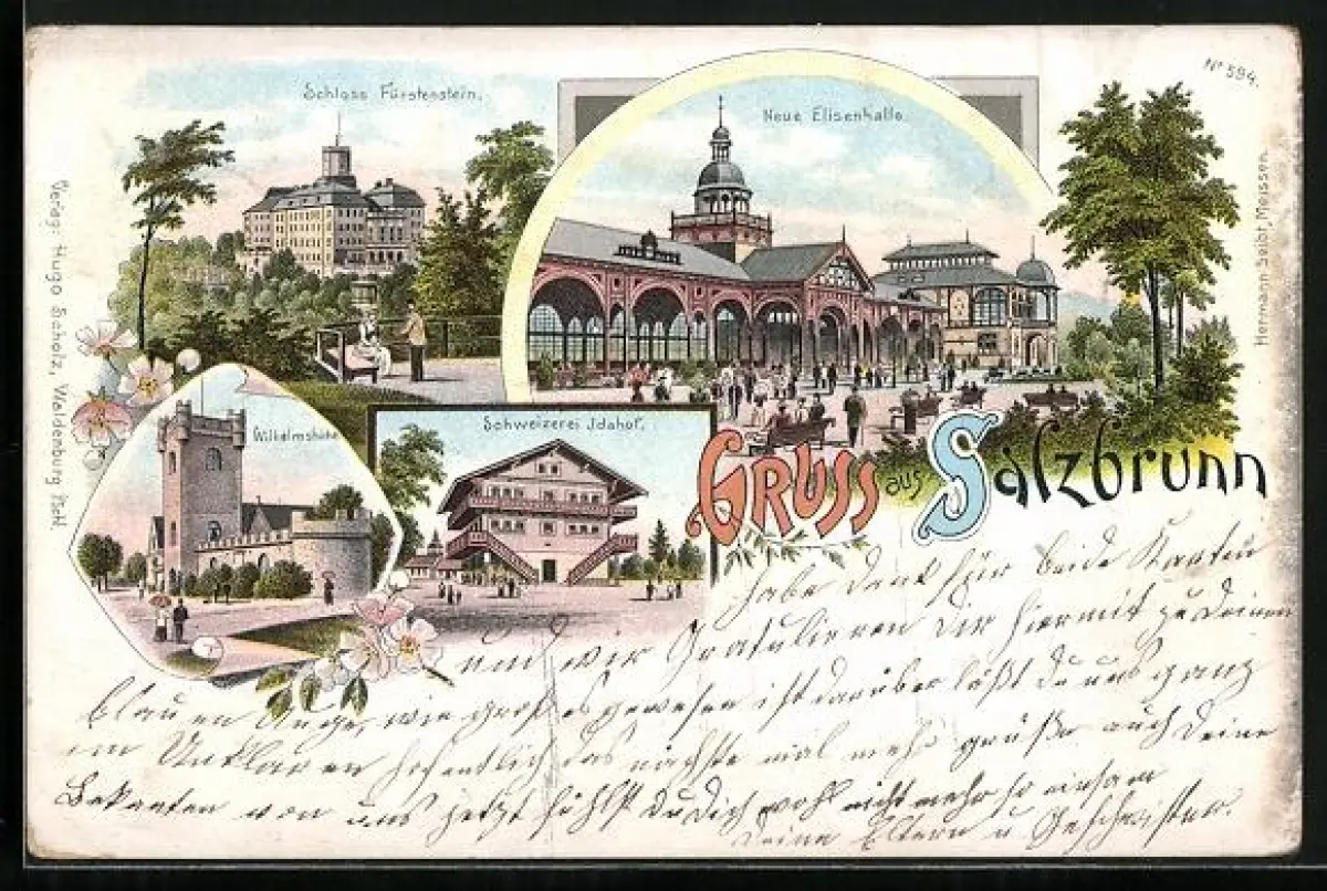 Lithographie Salzbrunn, Neue Elisenhalle, Gasthaus Schweizerei Idahof, Schloss Fürstenstein