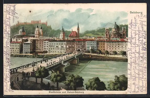 Lithographie Salzburg, Stadtbrücke und Hohen-Salzburg