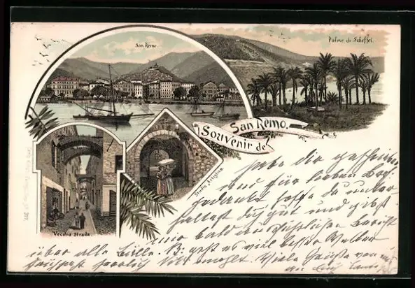 Lithographie San Remo, Vecchia Strada, Palme di Scheffel, Panorama