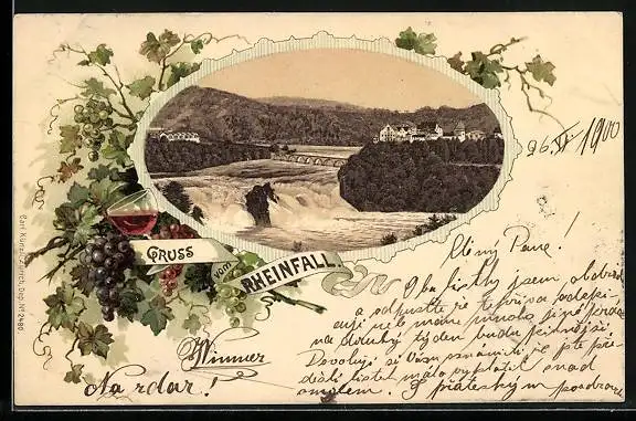 Lithographie Schaffhausen, Rheinfall mit Brücke im Rahmen, Reben mit Weinglas