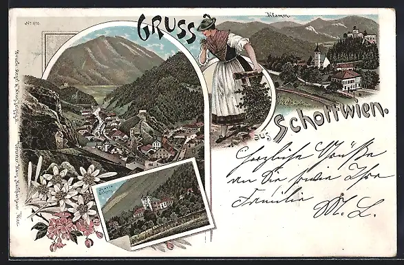 Lithographie Schottwien, Blick auf den Ort, Frau in Trachten, Klamm