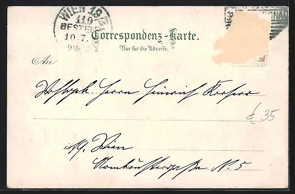 Personenbezogene Daten auf der Rückseite der Karte wurden durch blauen Textmarker unkenntlich gemacht. Die blauen Stellen sind auf die Vorderseite durchgeweicht und wirken sich negativ auf das Postkartenfoto aus